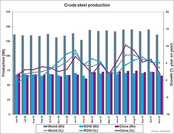 美国2017年11月粗钢产量为670万吨,同比提高8.5%。
