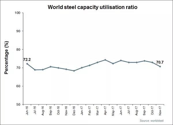 2017年11月全球66个纳入世界钢铁协会统计国家的粗钢产量为1.363亿吨,同比提高3.7%;粗钢产能利用率为70.7%,同比提高1.5个百分点,环比下降2.2个百分点。